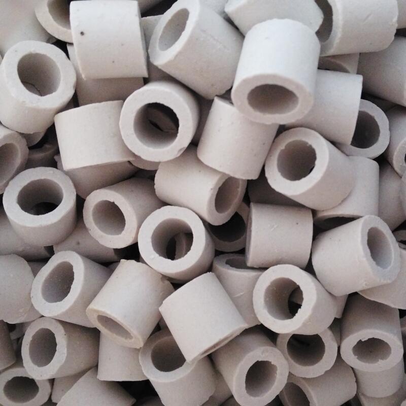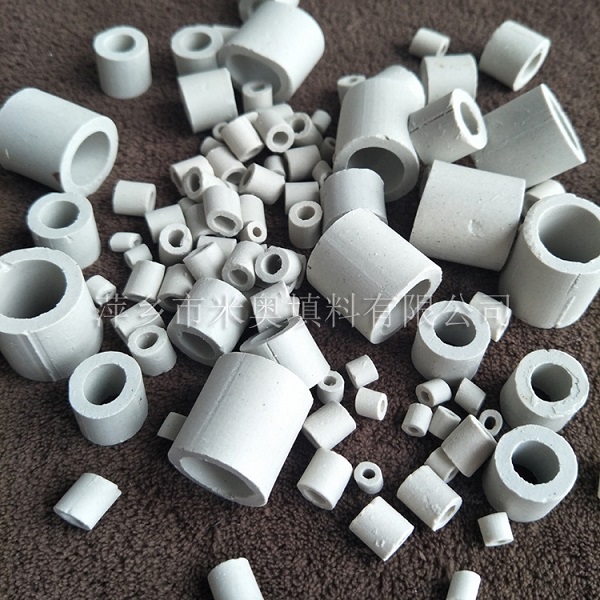 陶瓷拉西環(huán)是最早開發(fā)的一種散堆填料。陶瓷拉西環(huán)的形狀簡單,其高度與直徑尺寸相等。大尺寸的拉西環(huán)(100MM以上)一般采用整砌方式規(guī)則填充,100mm尺寸以下的拉西環(huán)一般采用亂堆方式裝填。