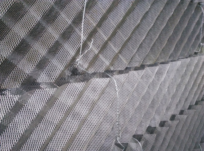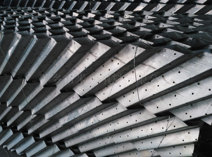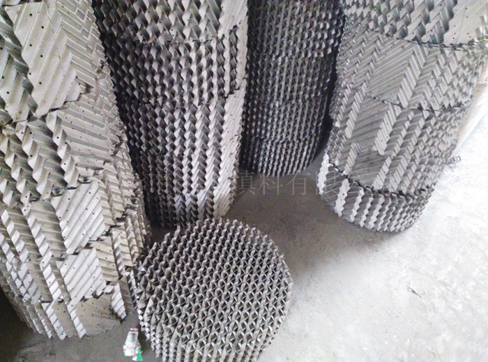 金屬波紋填料是用金屬薄板沖壓、拉伸成特定的壓延網(wǎng)片,表面成規(guī)則的菱形網(wǎng)孔、保持絲網(wǎng)波紋填料的幾何規(guī)則結(jié)構(gòu)沖壓成波紋片,再組成盤狀波紋規(guī)整填料。網(wǎng)孔波紋填料傳質(zhì)規(guī)律接近絲網(wǎng)波紋填料,每米填料的理論板數(shù)高于孔板波紋填料。由于網(wǎng)板可用各種金屬材料加工,選材面較絲網(wǎng)填料廣,因而耐腐蝕性能好。